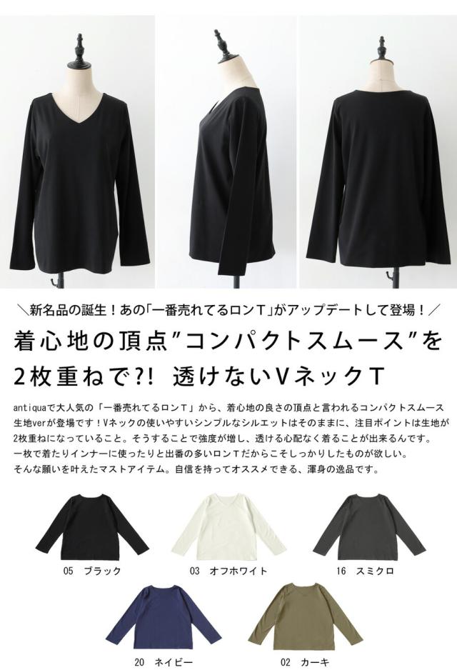 【検索ワード】VネックロンT レディース トップス 長袖 綿100 無地 シンプル Vネック コンパクトスムース カットソー Tシャツ プルオーバー 透けない レイヤード インナー レイヤードインナー 重ね着 綿 コットン コットンロンt オーバーサイズ 大きめ 大きいサイズ サイズ展開 M L XL antiqua アンティカ 大人 おしゃれ 10代 20代 30代 40代 50代 60代 春 秋 冬 お洒落 カジュアル かわいい かっこいい あんてぃか