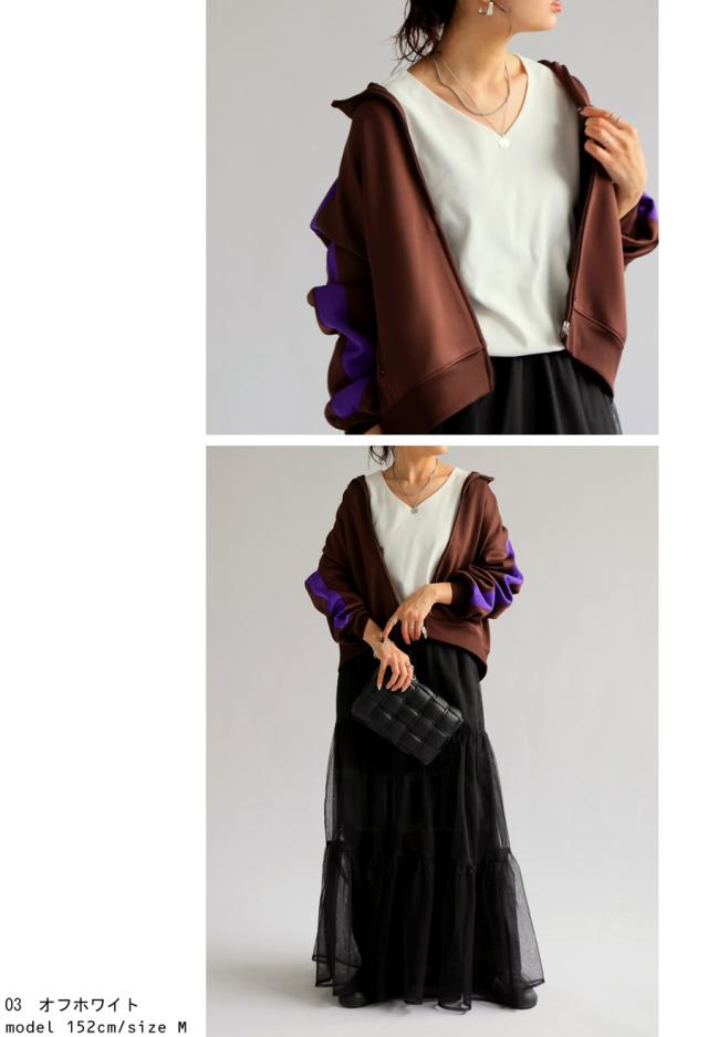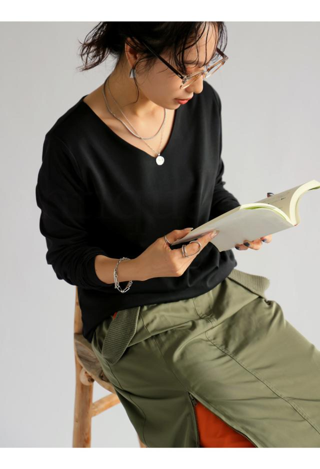 ・顔回りをすっきりと魅せて着痩せ効果抜群のVネック。