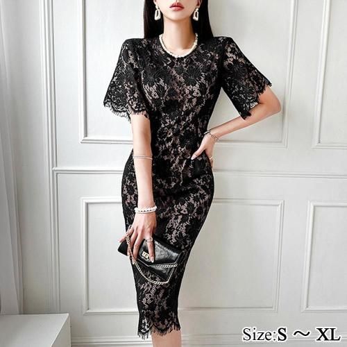 【グラシア】 キャバ ドレス キャバドレス ワンピース ミディアムドレス タイト ヒップライン 総レース レース ブラック S M L XL