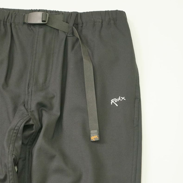 ROKXのアクティブスポーツシリーズを代表する、 運動性とカジュアルさを兼ね備えたストレッチ裾リブパンツ。 しなやかな肌触りと光沢感のあるコットンに、 強度と速乾性に優れたナイロンをミックスした生地はストレッチ性も備えており、 裾に向かってテーパードするスリムなシルエットにもかかわらず、窮屈さはなく快適な吐き心地をキープ。 ROKXパンツの特徴である股下のガゼットクロッチやウエストのウェビングベルト、 膝の立体裁断などクライミングパンツとしてのベーシックなディテールも健在。 リフレクターにもなっている左腿上部のワンポイントロゴ、 ハイカットブーツ対応のジッパー開閉の処理が施された裾、 両サイドのポケットとバックポケットなど、ハイキングなどでの使い勝手も抜群。 ハイキングや自転車、野外フェス、デイリーユースまで幅広く、シーズンを通して活躍してくれます。 | ||||||