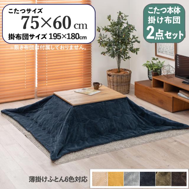 【2点セット】こたつ+薄掛けこたつふとんセット 無地 ネイビー 全6色 長方形 テーブル 75×60cm 無垢材調3Dシート 石英管ヒーター コンパクトコタツ ちいさめ CART-PIQUE