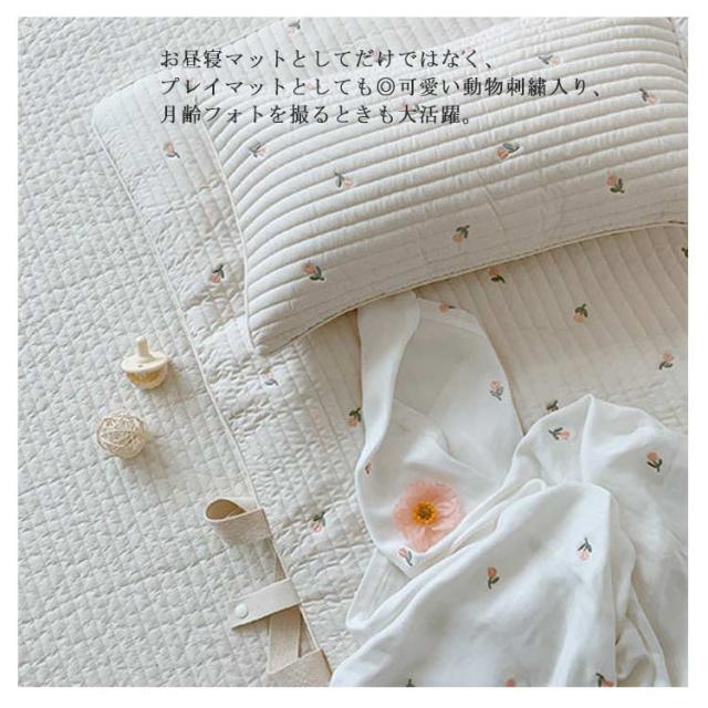 | バッグ型に折りたためるから持ち運びに便利♪ 持ち手とスナップボタンが付いているので、コンパクトに畳んで持ち運べます。 幼稚園や保育園でのお昼寝にはもちろん、おうちの中でも外出先でも、サッと広げてお昼寝スペースに。 お肌に優しい綿素材、敏感な赤ちゃんでも安心してお使い頂けます。 両面使えるリバーシブル仕様なので気分によって使い分けが可能。 お昼寝マットとしてだけではなく、プレイマットとしても◎可愛い動物刺繍入り、月齢フォトを撮るときも大活躍。 | |