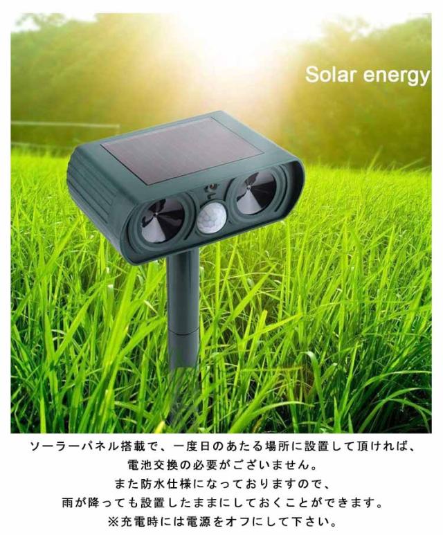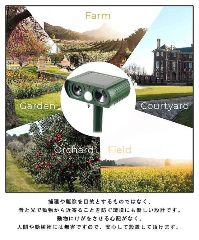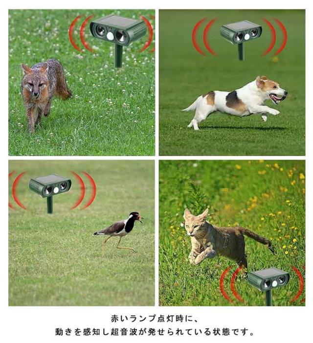 | 猫や周りに危害を加えることなく、音(超音波)とフラッシュライトを使って驚かすことで猫が近づくことを防ぐネコよけ、撃退器です。 鳥類(カラス、スズメ、ハト、ムクドリ、ヒヨドリ等)、ハクビシン、タヌキ、キツネ、ネズミなどの様々な動物に効果が期待できます。設置するだけで周辺に害鳥、害獣が寄り付かずに、捕獲用の罠を設置することなく撃退することができます。 動物の嫌がる高周波数の音と、夜行性の動物の嫌がるライトが点灯することで動物の慣れを防ぎ、近づくこと=恐いと感じさせることで、その後に周辺に近づくことを防ぎます。 ソーラーパネル搭載で、一度日のあたる場所に設置して頂ければ、電池交換の必要がございません。また防水仕様になっておりますので、雨が降っても設置したままにしておくことができます。※充電時には電源をオフにして下さい。 捕獲や駆除を目的とするものではなく、音と光で動物から近寄ることを防ぐ環境にも優しい設計です。動物にけがをさせる心配がなく、人間や動植物には無害ですので、安心して設置して頂けます。 赤いランプ点灯時に、動きを感知し超音波が発せられている状態です。 | |
