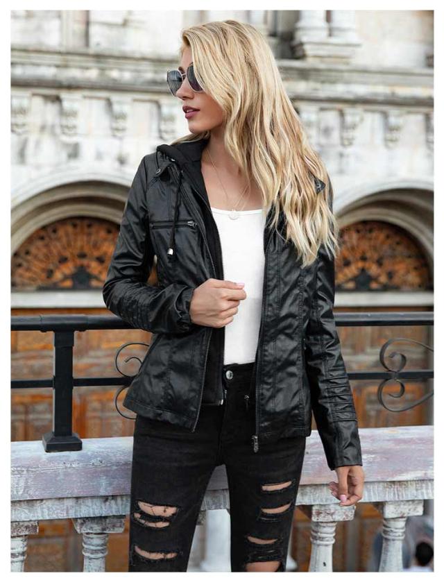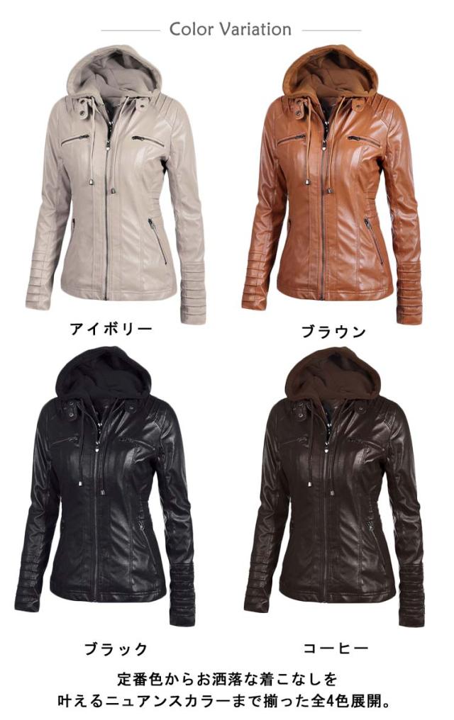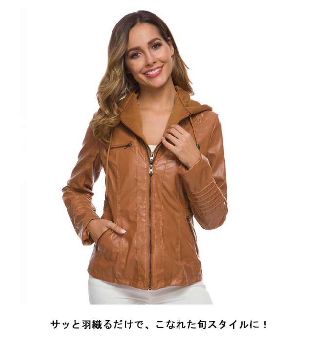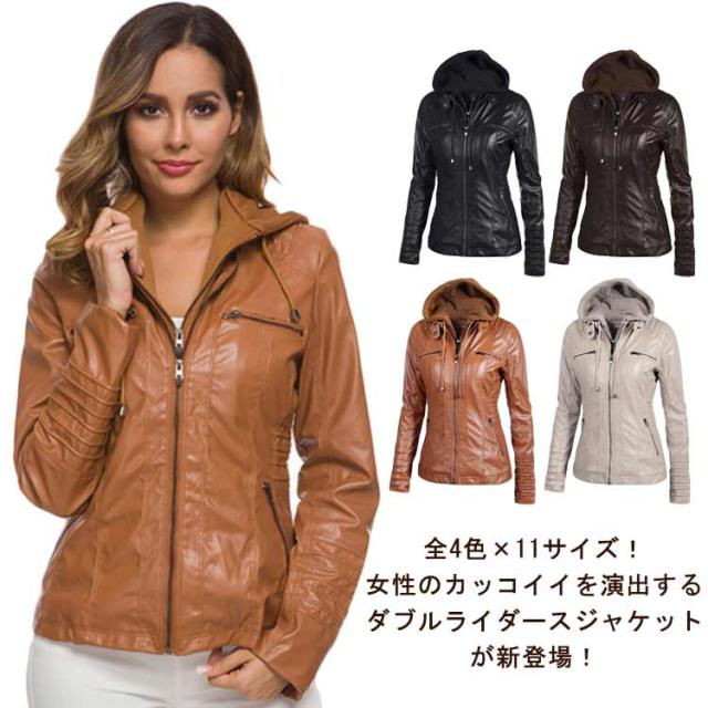 フェイクレザージャケット ブルゾン レザージャケット ライダースジャケット フェイクレザー 合皮ジャケット フード付き レディース 春秋冬 ダブルジップ パーカー PU 合皮 カジュアル ショート丈 大きいサイズ スリム 体型カバー 通勤 カッコイイ ギフト