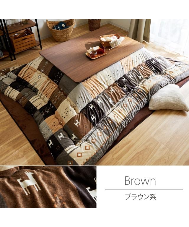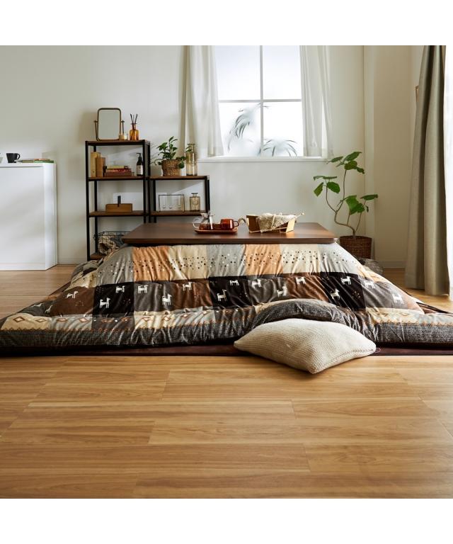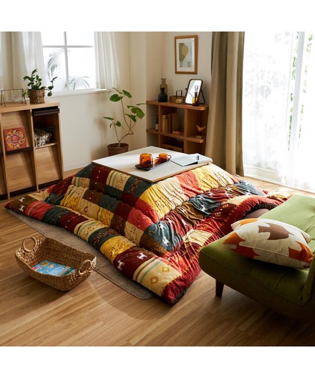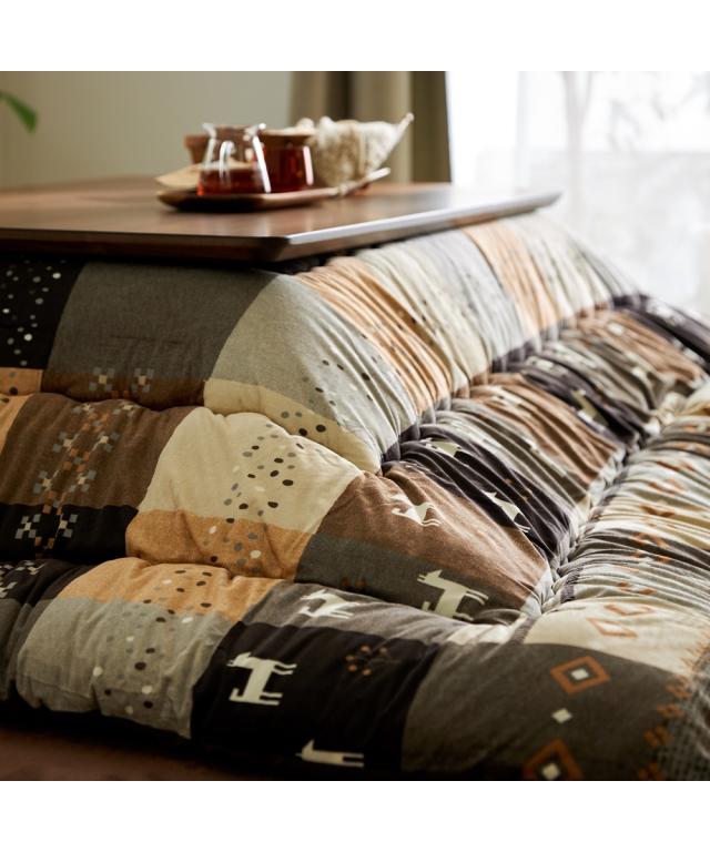 中わたに軽量で弾力性に優れた機能わたを使用した動物柄とパッチワークがカワイイこたつ掛け布団。表生地は手触りが気持ちいい短毛マイクロ素材、肌が触れる裏生地はサラッとした肌ざわりのピーチスキン素材です。