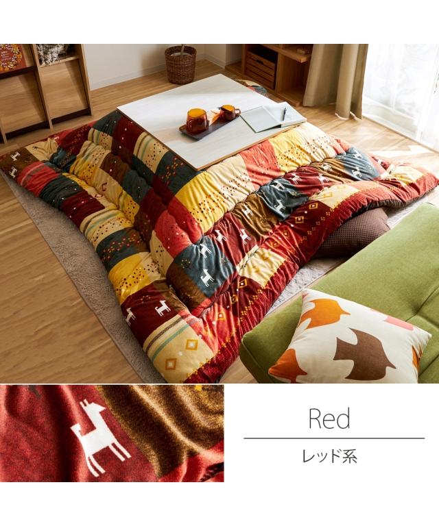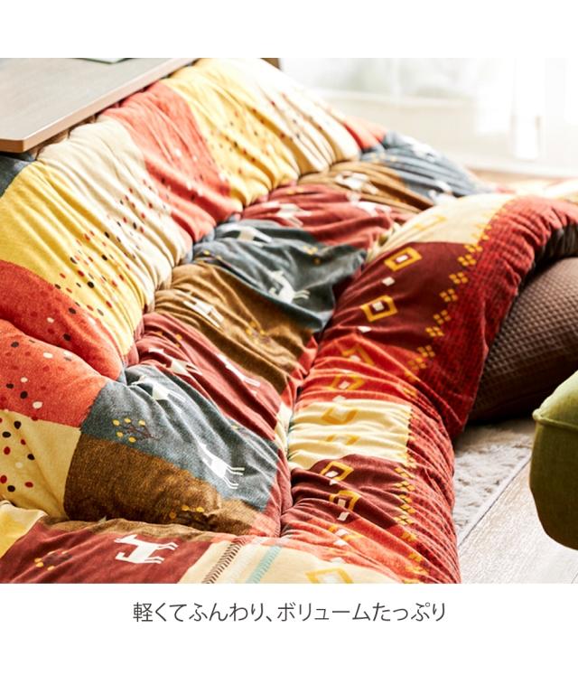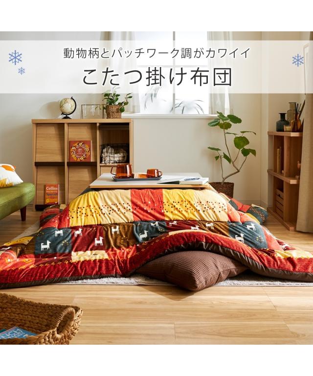 中わたに軽量で弾力性に優れた機能わたを使用した動物柄とパッチワークがカワイイこたつ掛け布団。表生地は手触りが気持ちいい短毛マイクロ素材、肌が触れる裏生地はサラッとした肌ざわりのピーチスキン素材です。