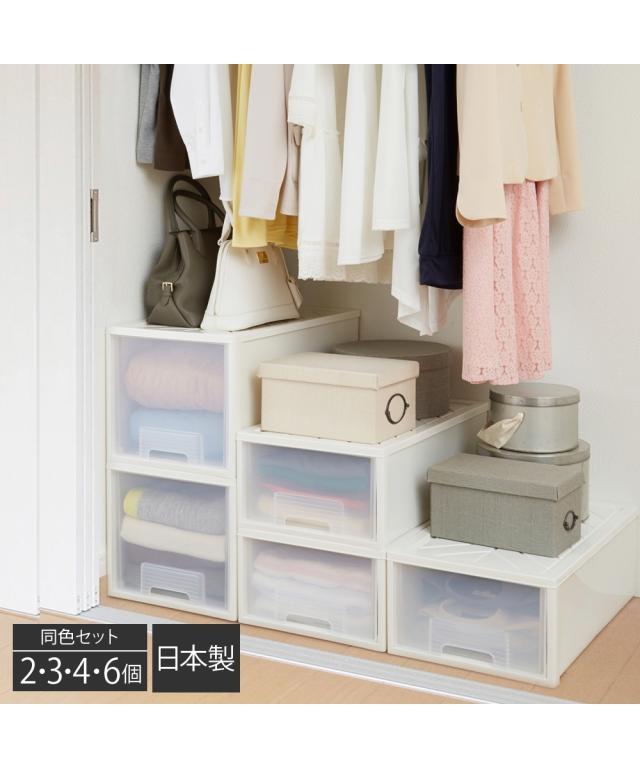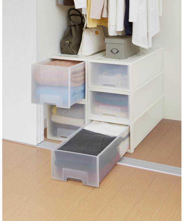 [keyword] 家具 収納 インテリア プラスチック 樹脂 シンプル ベーシック 定番 おしゃれ 組立不要の完成品 完成 楽 [comment] 奥行が深めのクローゼットや、奥行が浅めの押入れにおすすめのシンプルな衣装ケースです。本体は清潔感のあるホワイトにクリアのケースなので、中身がわかりやすく便利にお使いいただけます。浅型タイプはTシャツ・下着・靴下・キャミソール・ストッキングなどの小さくたためる衣類の収納に適しています。深型タイプはトレーナー・セーター・コート・ダウンジャケット・スキーウェアなどの冬物収納におすすめです。