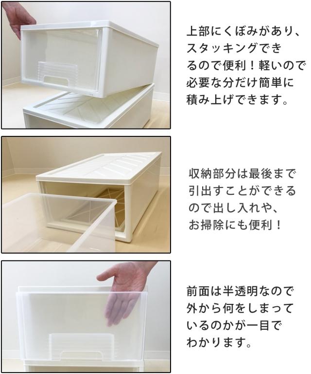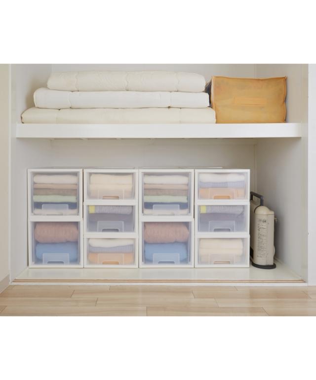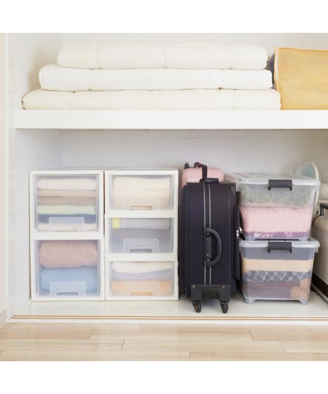 [keyword] 家具 収納 インテリア プラスチック 樹脂 シンプル ベーシック 定番 おしゃれ 組立不要の完成品 完成 楽 [comment] 奥行が深めのクローゼットや、奥行が浅めの押入れにおすすめのシンプルな衣装ケースです。本体は清潔感のあるホワイトにクリアのケースなので、中身がわかりやすく便利にお使いいただけます。浅型タイプはTシャツ・下着・靴下・キャミソール・ストッキングなどの小さくたためる衣類の収納に適しています。深型タイプはトレーナー・セーター・コート・ダウンジャケット・スキーウェアなどの冬物収納におすすめです。