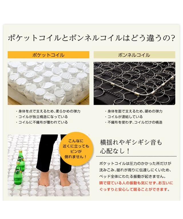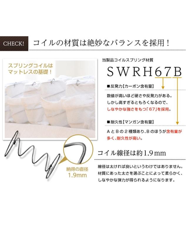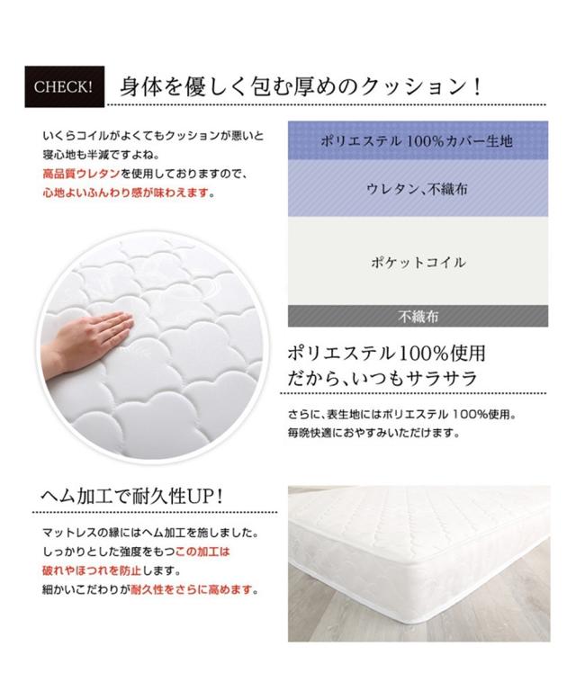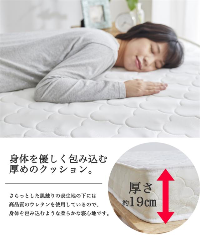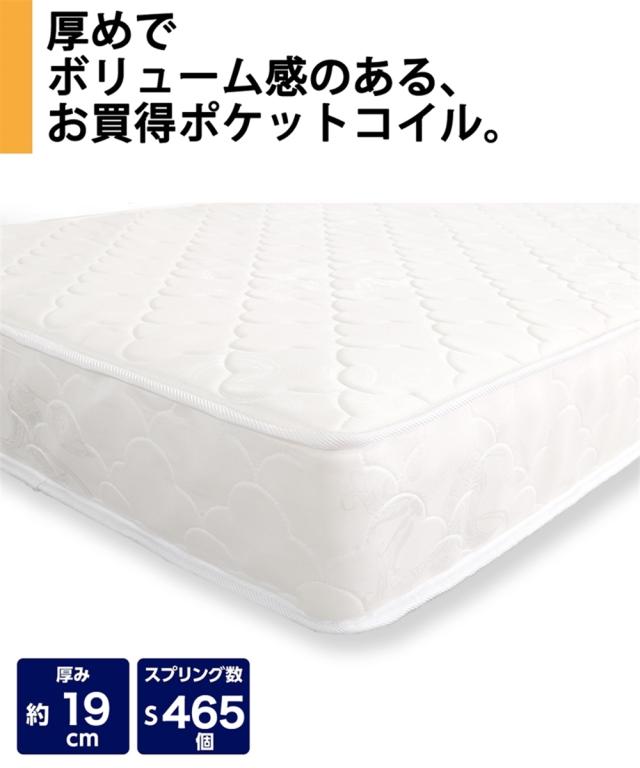 [keyword] 家具 収納 インテリア ウレタン シンプル ベーシック 定番 おしゃれ 一人暮らし 大学生 社会人 ワンルーム 1K 1DK 新生活 [comment] 厚みが約19cmもあるボリューム感のあるお買い得ポケットコイルマットレス。サラッとした肌触りの表生地の下には高品質ウレタンを使用しているので、身体を包み込むような柔らかな寝心地です。