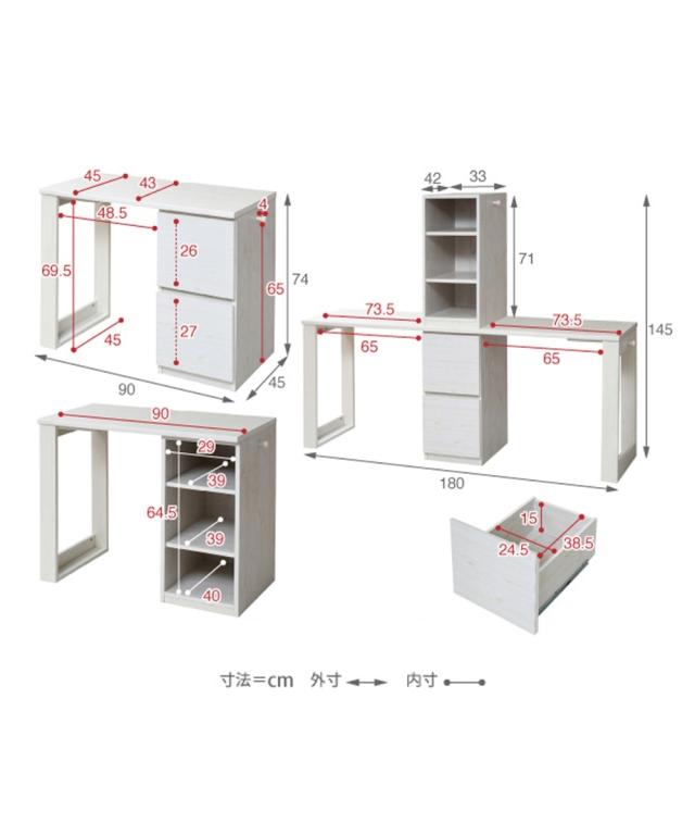 ●材質:本体・天板=プリント紙化粧繊維板、引き出し前板=合成樹脂化粧パーティクルボード(塩化ビニル樹脂)●可動棚(約3.2cmピッチ):2枚●付属品:フック4個●背面化粧仕上げ●商品重量:(約)41kg●耐荷重:(約)デスク=30kg、棚板=8kg、引き出し=7kg 原産国:●中国製 備考:全体=(約)幅180×奥行45×高さ145cm デスク単体=(約)幅90×奥行45×高さ74cm ラック=(約)幅33×奥行42×高さ71cm <梱包サイズ> ■個口数:1つめ 縦×横×高さ:96×49×13cm 重