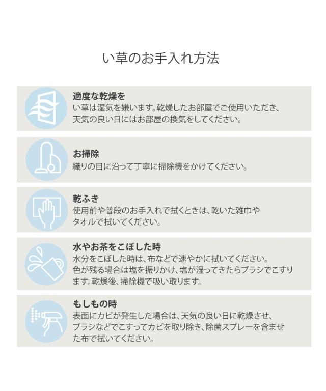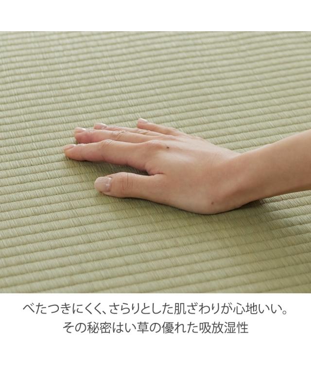 [keyword] インテリア 涼感 暑さ対策 夏 涼しい クール 抗菌 菌 はっ水 レジャー 外 撥水 雨の日 汚れ おでかけ 消臭 ニオイ イ草 天然素材 無地 無地調 柄 かわいい おしゃれ シンプル ベーシック 定番 オールシーズン 通年 春 秋 冬 年中 一年間 夏用 サマー [comment] 日本の高温多湿な風土に適した、畳素材のい草カーペットです。い草が持つ消臭効果・抗菌効果・調湿効果がクリーンな空間を作り出してくれます。優れた調湿効果でオールシーズンさらっと快適にお使いいただけます。表面には撥水加工を施しており、水をこぼしても、さっと拭き取れてお手入れもラクラクです。新しい畳のカバーとして、古くなった畳の代わりにと活躍してくれます。豊富な18サイズをご用意しておりますので、ぴったりサイズがきっと見つかります!
