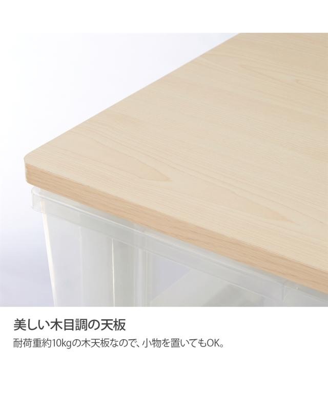 [keyword] 家具 収納 インテリア 木製 プラスチック 樹脂 シンプル ベーシック 定番 おしゃれ ナチュラル [comment] 中身が見えるクリアタイプなので、収納物がわかりやすく便利にお使いいただけます。光沢を抑えた半透明の引き出しに、ナチュラルカラーの木天板がマッチしたシンプルなデザイン。