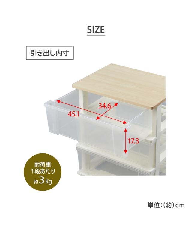 ●材質:本体=ポリプロピレン、天板=木目調化粧繊維合板 ●耐荷重:(約)天板=10kg、引き出し(1段あたり)=3kg ●コロキャスター付き ●収納目安(引き出し1段あたり):(約)Yシャツ6枚・セーター4枚・バスタオル6枚 原産国:●日本製 備考:<梱包サイズ> ■縦×横×高さ:56.5×42×42.5cm 重量:6.8kg ●組立時間:(約)20分