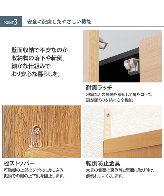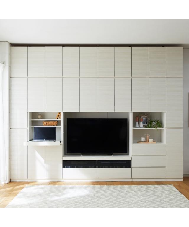 [keyword] 家具 収納 インテリア 木製 シンプル ベーシック 定番 おしゃれ ナチュラル 一人暮らし 大学生 社会人 ワンルーム 1K 1DK 新生活 [comment] 壁にすっきり収まって、大容量な収納力の壁面収納。扉付きなので見た目すっきり、大量に収納できます。扉自身に手をかけて開閉するタイプなので、取っ手のでっぱりがなく、スタイリッシュなデザインです。手をかける部分は手にやさしい丸みのあるフォルムになっています。扉にはダンパーが付いていて、ゆっくり静かに閉まる、やさしい仕様です。すべての移動棚は、背面板との間に隙間があるので、棚板の上下間で配線を通すことができます。棚の下側、側板には左右に配線穴が開いているので、棚を並べて置いた時にも、連結した棚を通して配線をすっきり横に流すことができます。家電などを中にしまっても配線がしやすく、便利です。
