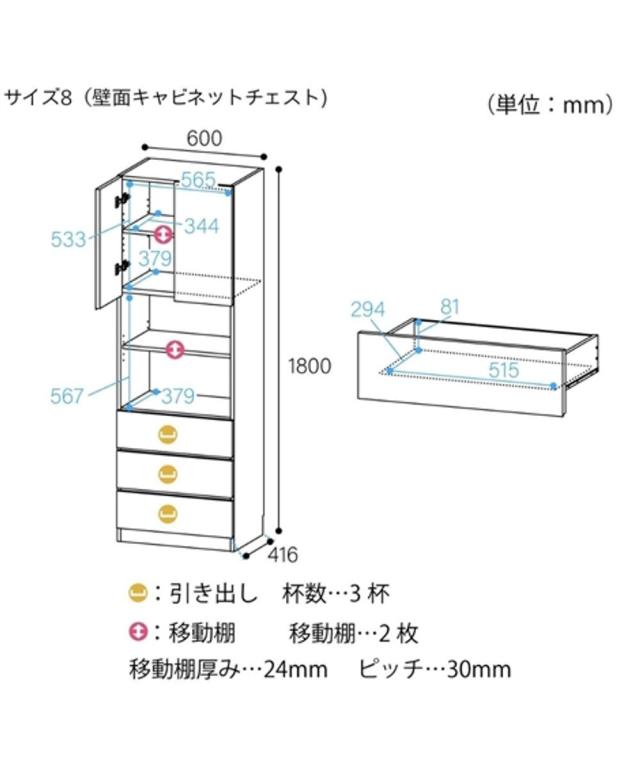 ●材質:本体=プリント紙化粧繊維板、その他=スモークガラス●可動棚(約3cmピッチ):サイズ1・2=各1枚、サイズ3・8・9=各2枚、サイズ4・5=各4枚、サイズ6=(大)2枚・(小)3枚、サイズ7=(大)(小)各2枚●転倒防止具付(サイズ4〜9)●耐震ラッチ付 原産国:●日本製 備考:<梱包サイズ> ■壁面キャビネットチェスト 個口数:1つめ 縦×横×高さ:182.5×11×41.5cm 重量:24kg 個口数:2つめ 縦×横×高さ:70.5×8×61.5cm 重量:14kg ●組立時間:(約)90分