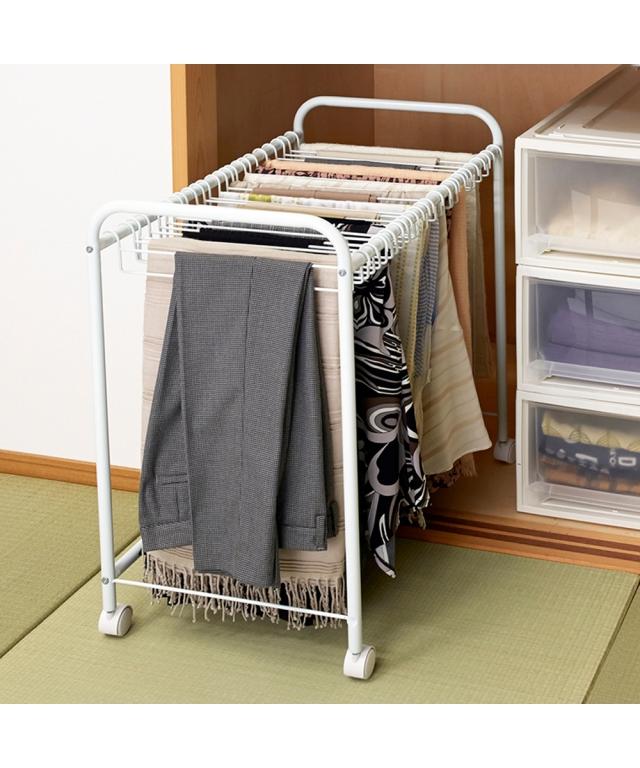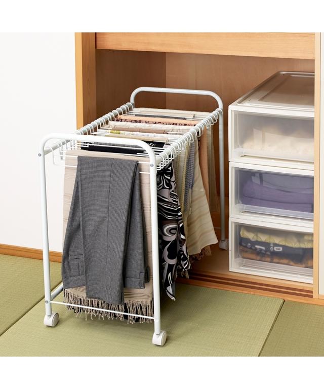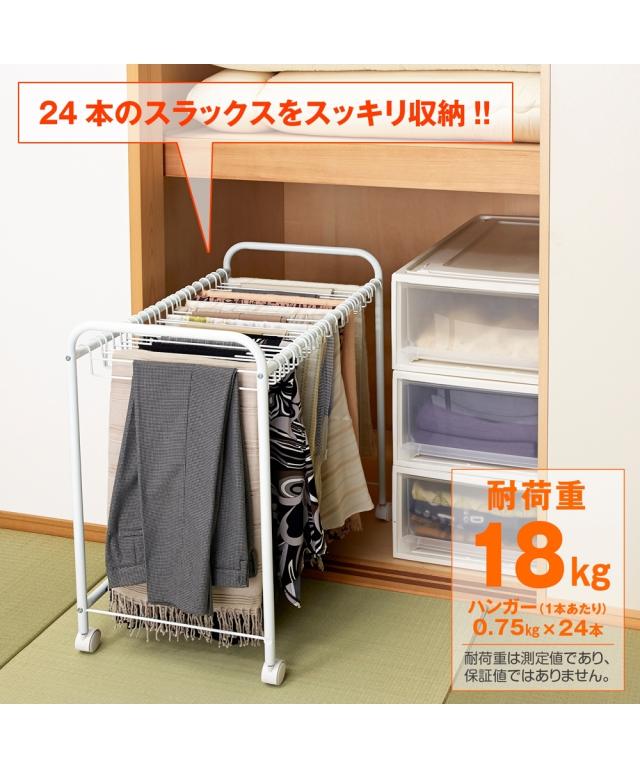 [keyword] 家具 収納 インテリア パイプ アイアン シンプル ベーシック 定番 おしゃれ ナチュラル [comment] 押入れ下段のスペースを有効活用できるスラックスハンガー。ボトムスやスラックス、ストール等を24本掛けられます。ハンガーは上から掛けるだけなので、衣類の入れ替えも簡単 キャスター付きで押入れからの出し入れもラクラク。