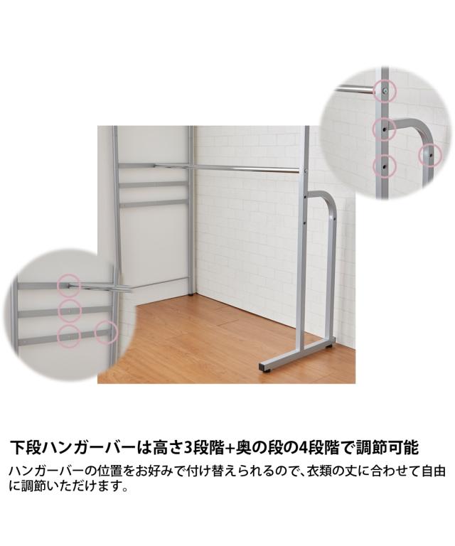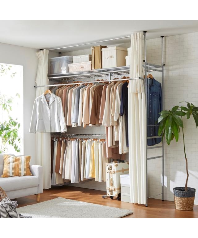 "掛けて!置けて!隠せる!収納力抜群のクローゼットハンガーです。高さ2タイプ・幅3サイズから選べて、縦にも横にも伸縮自在!上下左右に伸縮自在なので、お部屋のスペース、収納量によって自由に調整いただけます。前面には、ほこりや日光から衣類を守る2段式カーテン付き。カーテンは取り外して洗濯機で丸洗いができるので、清潔感を保てます。お出かけ前の洋服も""ちょい掛け""ができるフロントハンガーが便利!