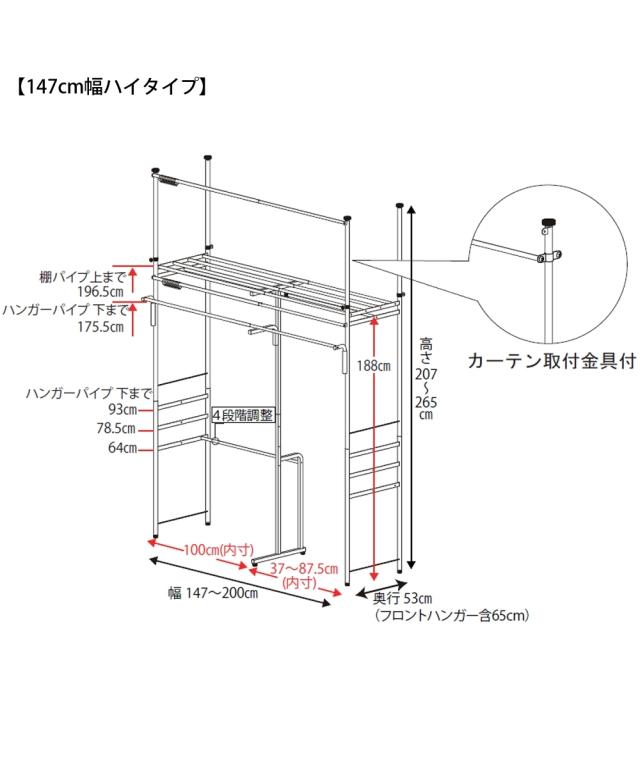 奥行53cm 上下左右伸縮自在突っ張り クローゼット ハンガー カーテン フロントハンガー付き 幅147cmハイタイプ