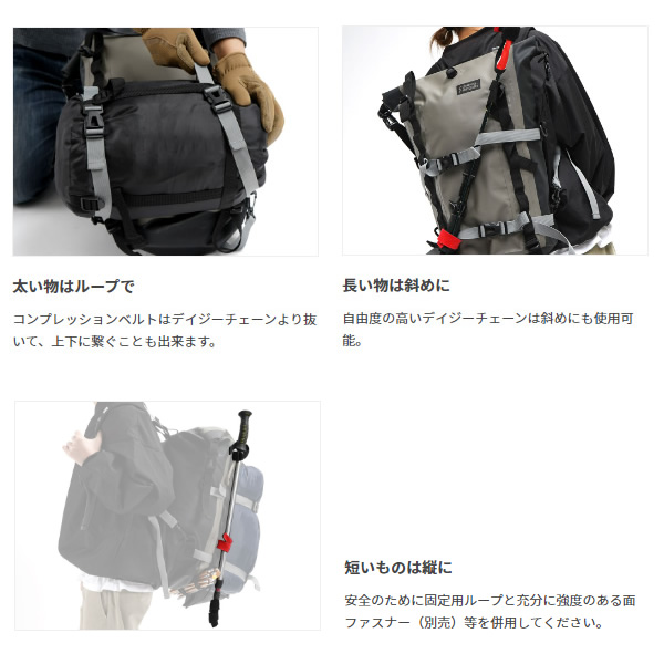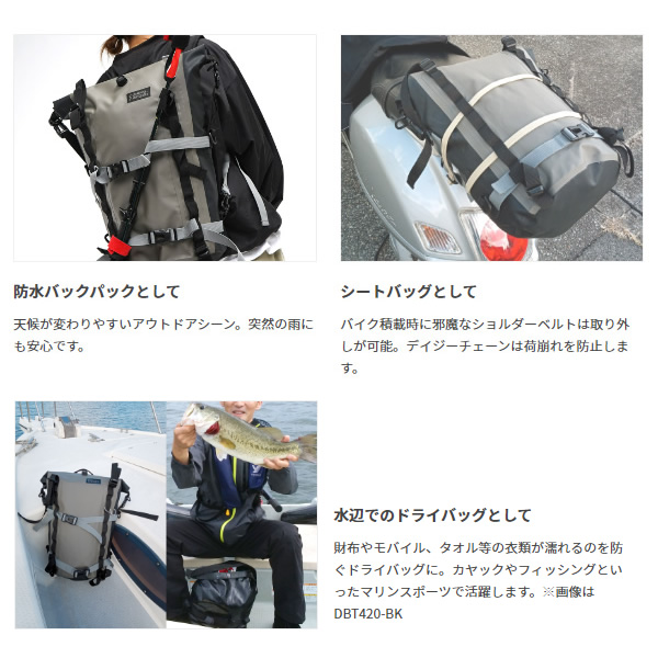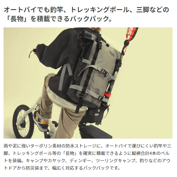 オートバイでも釣竿、トレッキングポール、 三脚などの「長物」を積載できるバックパック。 雨や泥に強いターポリン素材の防水ストレージに、 オートバイで運びにくい釣竿や三脚、トレッキングポール等の「長物」を 確実に積載できるように縦横合計4本のベルトを装備。キャンプやカヤック、 ディンギー、ツーリングキャンプ、釣りなどのアウトドアから防災袋まで、 幅広く対応するバックパックです。 ■カラー カーキ・ブラック ■サイズ W30×L(D)28×H48cm ■容量 20L ■静止耐荷重 10Kg ■材質 ターポリン ※記載は商品仕様の一部です。仕様説明不足等の理由での返品はできません。特に適合等は必ずご確認ください。