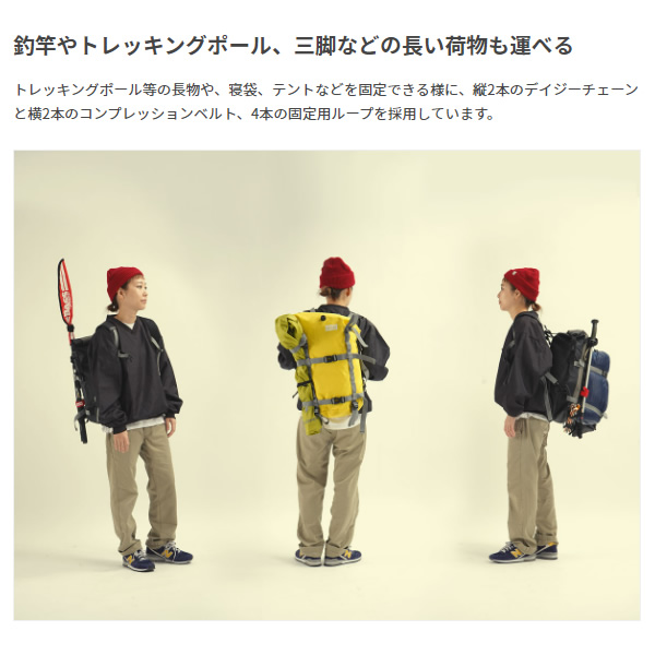 三脚などの「長物」を積載できるバックパック。