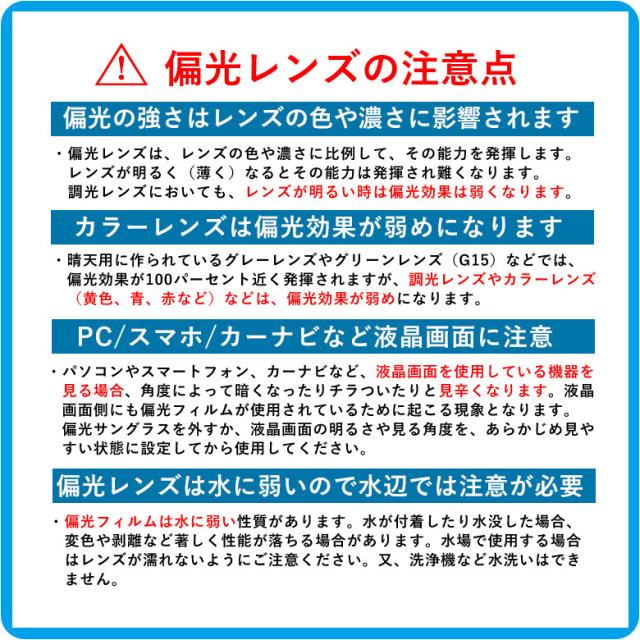 □偏光度:ライトグレー(約70-90%)/ ライトブルー(約40-70%)/ ライトピンク(約30-50%)/ ライトイエロー(約30-50%)