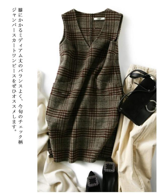 ジャンパースカート ワンピース 冬 秋 重ね着 Vネック ジャンパースカート ミディアム丈 レイヤード Aライン グレンチェック 可愛い フォーマル オフィスカジュアル 通学 通勤 秋 冬 ノースリーブワンピース