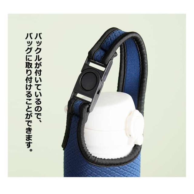 | シンプルなデザインのボトルカバー です。 バックルが付いているので、バッグに取り付けることができます。 高さ約18cm、直径約6.8cmまでのボトルや市販のペットボトルにも対応。 持ち運びしやすいように持ち手が付いています。バッグから取り出す際にも便利です。 ぴったりフィットして水筒の飛び出しを防止し、傷から守るカバーです。 保温・保冷素材を採用しているので、オールシーズン使用可能です。 | |