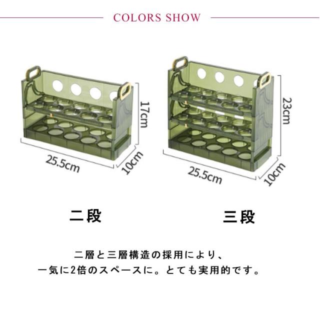 | サイズについての説明 | 二段:25.5*10*17cm,容量:卵20枚、 三段:25.5*10*23cm,容量:卵30枚 |