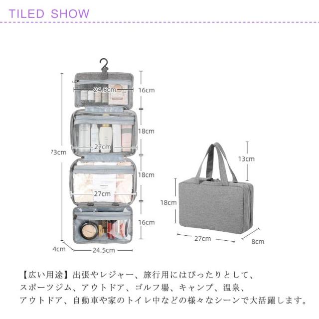| 【メイン素材】: 高品質のオックスフォード生地,はあなたの洗面用具の清潔と乾燥をさせます。通気性が良く異臭はなく、防水性、防塵性と耐用性もあります。 【収納力に優れる】化粧品、ヘアアクセサリー、シェービングツール、小物などの小物を収納できる3層ポケットを装備。前面が開放され、中身が一目でわかり、出入りがスムーズ。小型ドライヤーも快適に収納できます。 メインポケットは広いスペースがあり、ゴムバンドで仕切られており、化粧品ボトルを直立させて液体化粧品の漏れを防ぐことができます。 背面にはマスクを収納するためのポケットもあります。 【壁掛け可能】吊り下げ用の360°回転フック付きなので、壁に引っ掛けておけば物を取り出すのは楽々、物を取ったり置いたり便利です。それに、丁寧に縫製された手提げも付いているので、どこにも持ち運ぶ可能です。 【広い用途】出張やレジャー、旅行用にはぴったりとして、スポーツジム、アウトドア、ゴルフ場、キャンプ、温泉、アウトドア、自動車や家のトイレ中などの様々なシーンで大活躍します。 | |