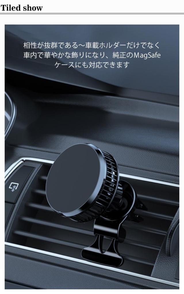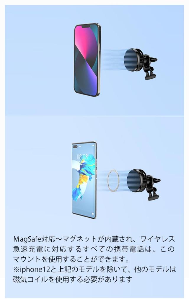 | 磁気ワイアレス充電車載ホルダー! スマート、急速冷却〜TEC半導体冷凍チップが内蔵され、充電中の過熱を防ぎます。 最大15Wワイアレス急速充電対応〜くっついた次第にワイアレス充電が始まります。 MagSafe対応〜マグネットが内蔵され、ワイヤレス急速充電に対応するすべての携帯電話は、このマウントを使用することができます。※iphone12と上記のモデルを除いて、他のモデルは磁気コイルを使用する必要があります。 360度回転可能〜ボールジョイントデザインで、360度自由に好きな角度を調節できます。 でこぼこ道にも対応でき、落下することもなくしっかりしている〜 相性が抜群である〜車載ホルダーだけでなく、車内で華やかな飾りになり、純正のMagSafeケースにも対応できます。 | |