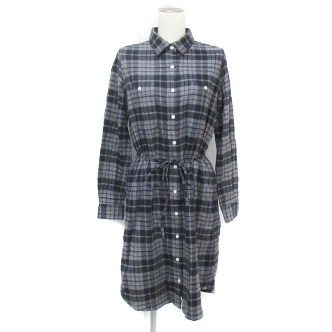 【中古】フリークスストア シャツワンピース ミモレ丈 長袖 リボン付き チェック柄 F グレー 黒 ブラック レディース