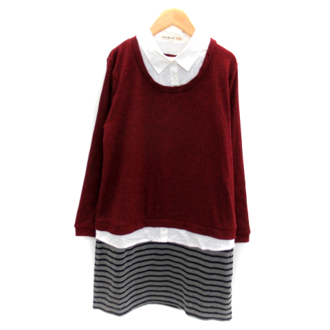 【中古】キューティーブロンド ドッキングワンピース ひざ丈 長袖 ニット シャツ ボーダー柄 L ボルドー レディース