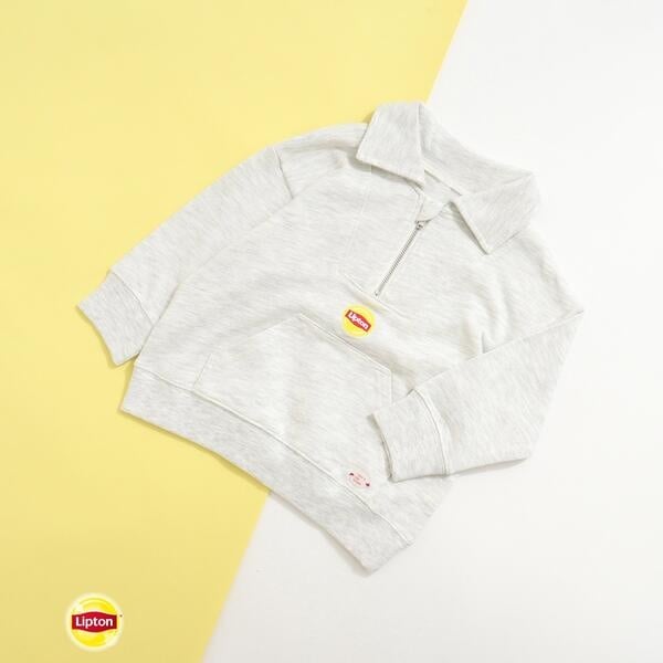 【リプトンコラボコレクション】おなじみのLiptonロゴ刺繍がポイントになったトレンドのハーフジップトレーナー。レモンティーとミルクティーをイメージした2カラーをご用意。バックプリントには、イエローラベルや様々なフレーバーのプリントが入っていて、後ろ姿もとっても可愛い♪