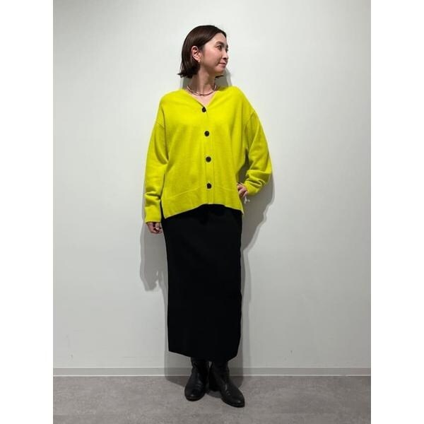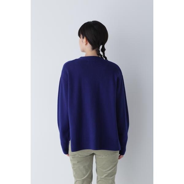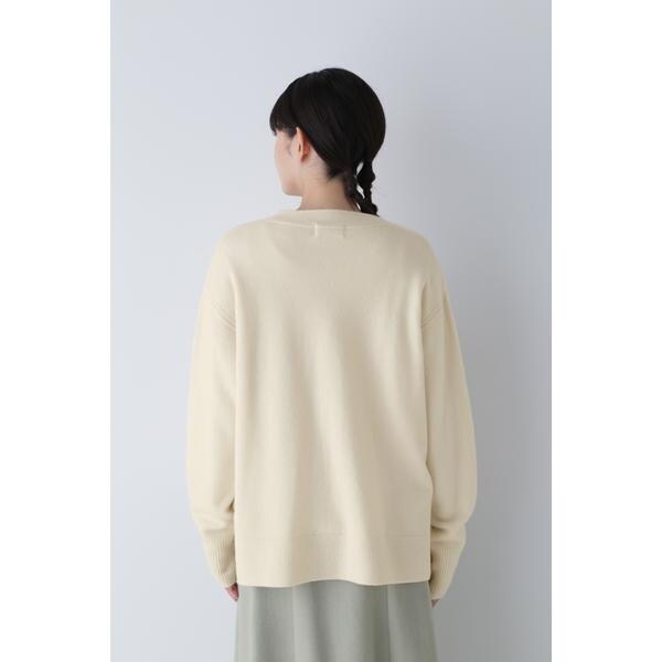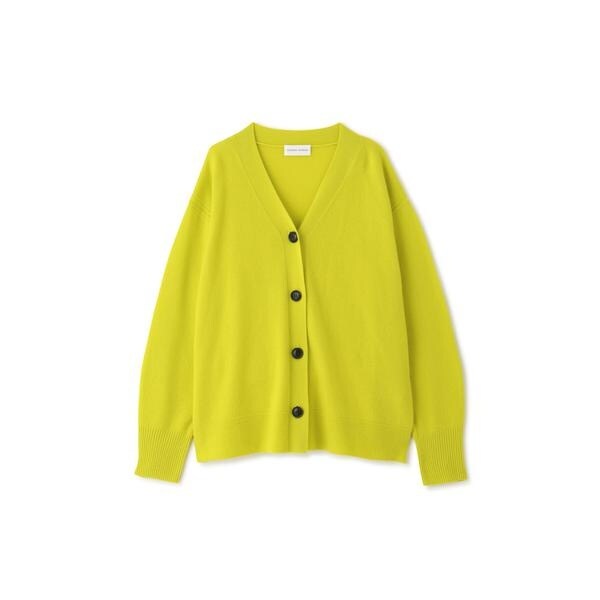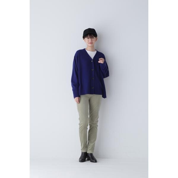 大きめの黒ボタンがアクセントになっているVネックカーディガン。脇に裏目を立てライン使いにすることで縦目を強調したデザインに仕上げました。