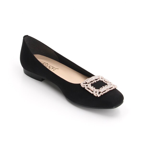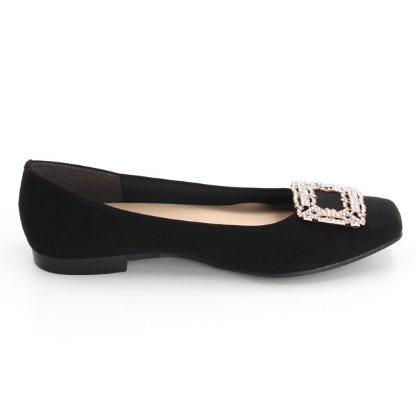 キラッと輝くビジューバックルがポイントのフラットパンプス。