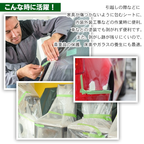 | 養生テープとは、仮止め用のテープです。 主に工事や引越しの際などに家具が傷つかないように包む 養生シートを止めるために使われています。 粘着力がそこまで強くないので、壁や家具の塗装が剥がれずに貼ることができます。 ◎手でカット 手で簡単にちぎることができるのも特徴です。 ハサミなどを使わなくても、繊維のおかげでまっすぐ切ることが可能です。 ◎家具や車に 養生テープは、もともと短期間で剥がす前提のものなので、粘着力が弱く、 壁や家具などに直接貼り付けても簡単に剥がすことが出来て、塗装が剥がれません。 壁にポスターを貼り付けたり、賃貸でも気兼ねせずに使うことができます。 車などの塗装でも剥がれず便利です。 ◎メモ帳として 養生テープは油性マジックで字を書くことも可能です。 中身の分からなくなりがちな衣装ケースごとにメモ書きして貼り付けることで 衣替えもスムーズになります。 剥がしやすいので、中身を入れ替えた時には貼り直しも簡単です。 ◎掃除に 便利な養生テープ活用術として隙間汚れの防止にも使えます。 ドアレールなどの隙間部分は汚れがたまりやすいのに、掃除のしにくい部分ですよね。 そんな場所に養生テープを貼っておくと、汚れ防止にもなりますし、 汚れたら養生テープを剥がして新しく貼るだけでいいので、お掃除がとっても簡単になります! |