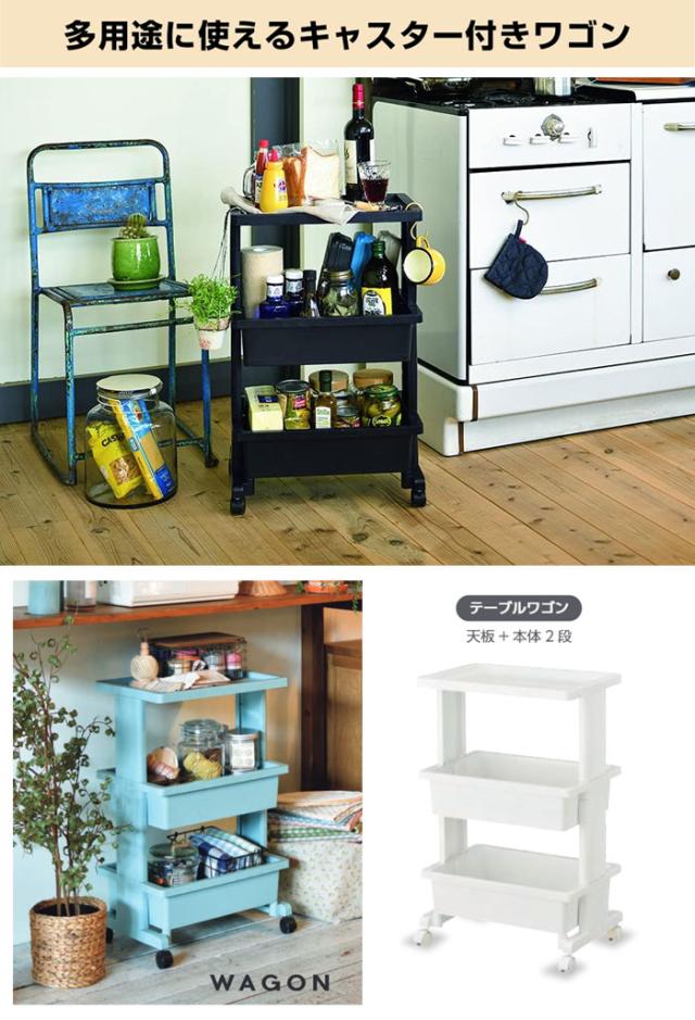 | 用途に合わせて選べるテーブルワゴンシリーズ。 ちょっとしたものを置ける天板が作業時に使いやすいテーブルワゴン。 2Lペットボトルが収納でき、取り出し口が広いので出し入れラクラク。 調味料や食品、消耗品のストック入れに最適。 ベビー用品や掃除道具など必要なものをひとまとめにしておけばサッと取り出して使えます。 使いたい場所へ移動したり、動かして掃除しやすいキャスター付き。 工具のいらない簡単組立式で、部品をカチン、カチンとはめていくだけで簡単にできあがります。 |