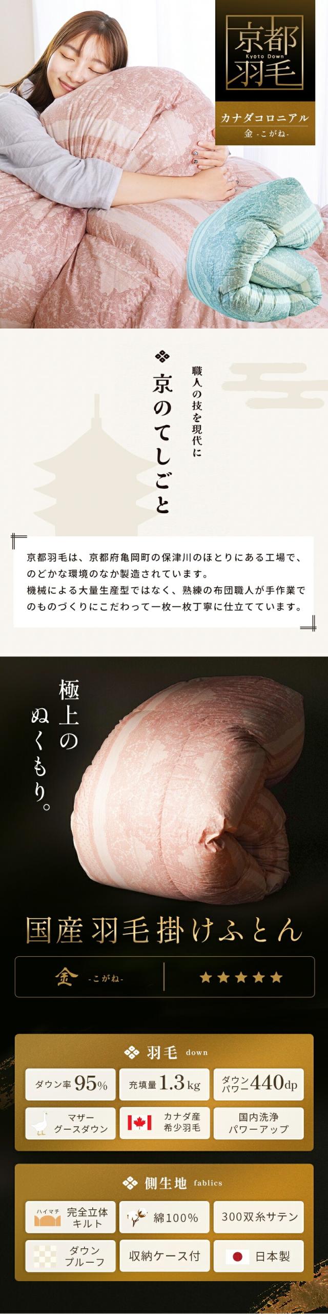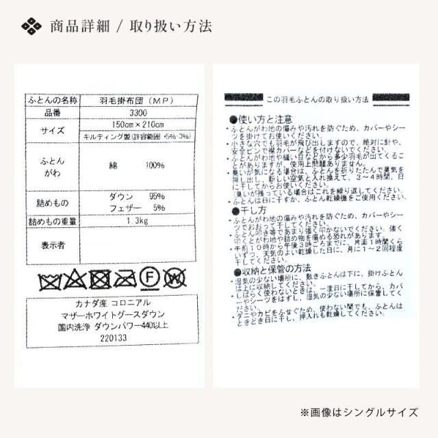 [ keyword | 羽毛布団 シングルロング マザーグースダウン95% 150×210cm 完全立体キルト 京都職人の羽毛布団 増量1.3kg 440dp以上 日本製 京都羽毛 「金」 カナダ グース コロニアルダウン 綿100% シングル 秋冬 金銀銅 ]