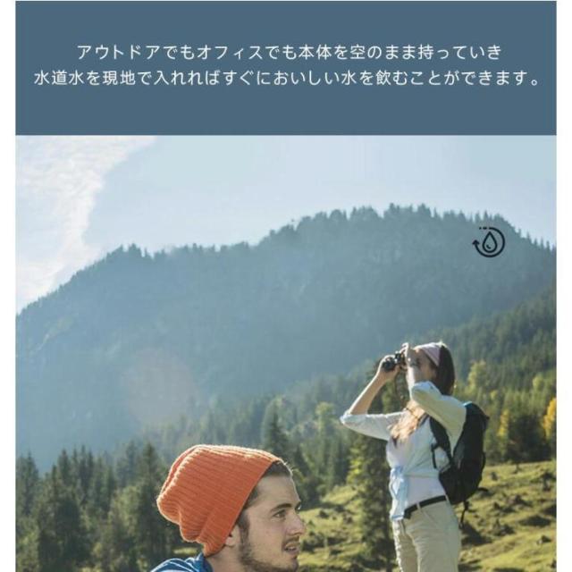 アウトドアでもオフィスでも本体を空のまま持っていき、水道水を現地で入れればすぐにおいしい水を飲むことができます。