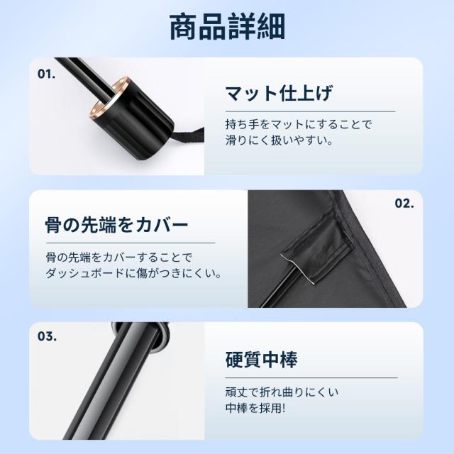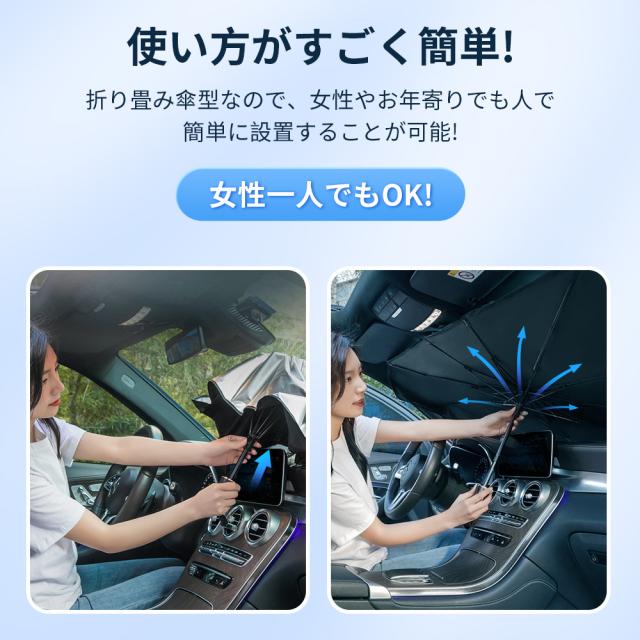 強い日差しをシャットアウトし、遮熱・遮光はもちろんのこと、車の劣化防止にも。 傘タイプなので開くだけで簡単に設置可能。コンパクトなので座席ポケットやダッシュボードに収納していただけます。