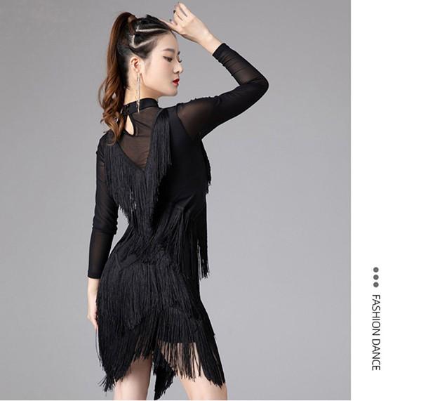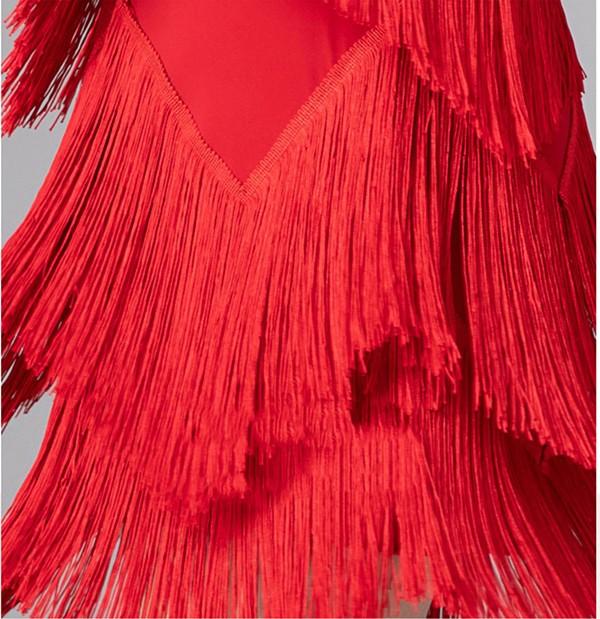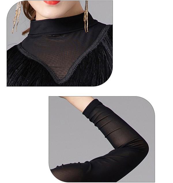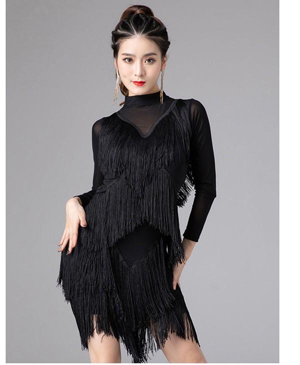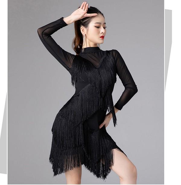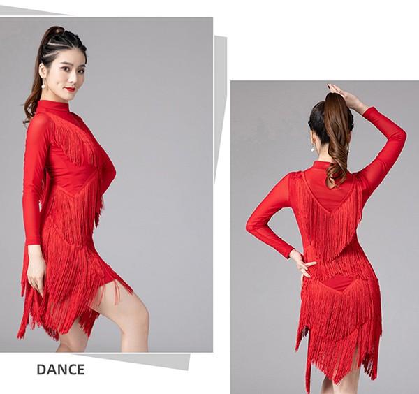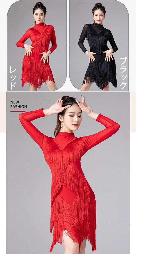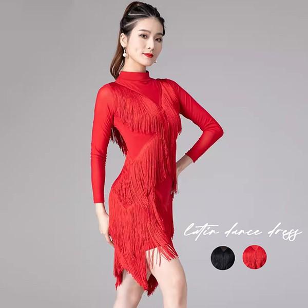 社交ダンス ラテンドレス 社交ダンス ワンピース ダンス衣装 演技服 ワンピース 透け感 装飾あり 練習着 長袖 ワルツ チャチャチャ ラテン ステージ衣装 演出着 演出用 フリンジ 黒 赤as015s1s1l9