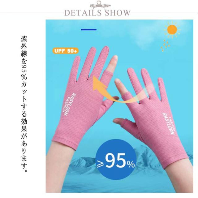 | 日焼け対策、夏のお出かけには欠かせない手袋です。 紫外線を95%カットする効果があります。 涼しい肌触り、汗を吸ってもすぐに乾きます。 肌に優しい素材で、通気性で蒸れない。 親指と人差し指がカットされて、スマホの操作や細かな作業も行いやすくい。 手のひらには滑り止めが付いているので、ドライブやサイクリング時の安定性を向上させます。 | |