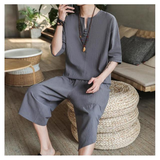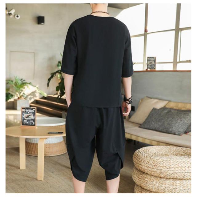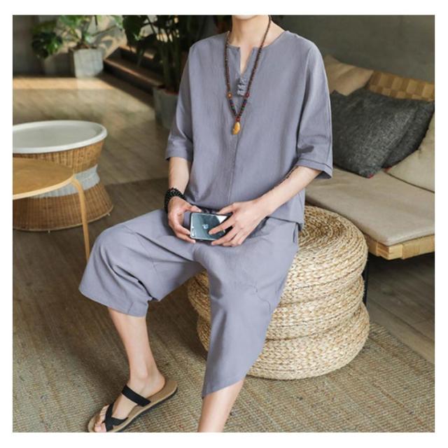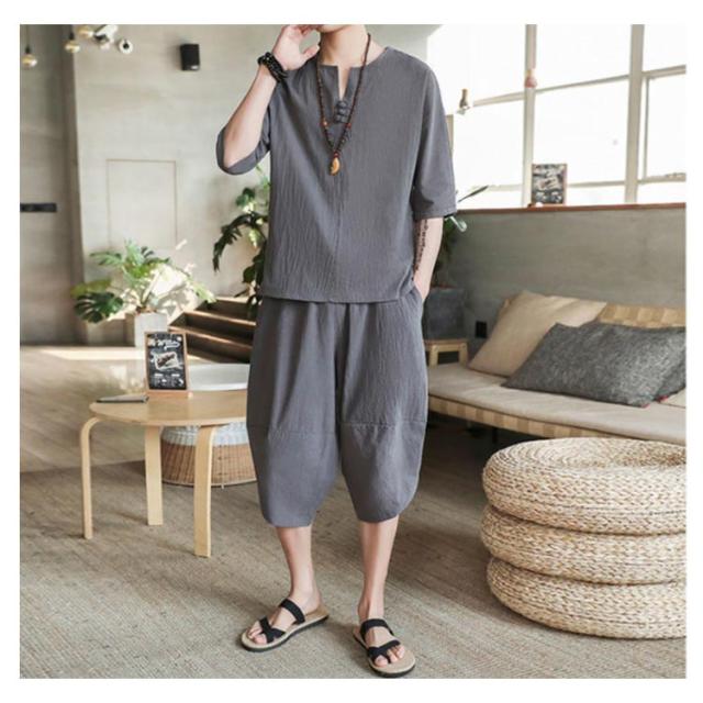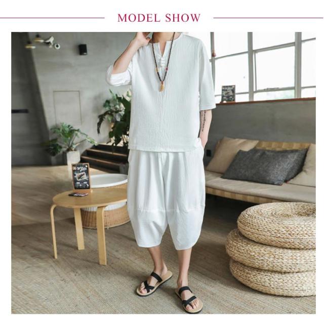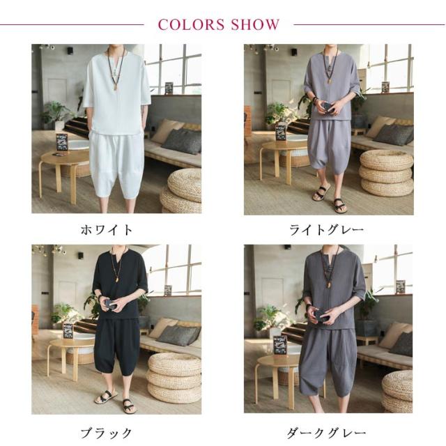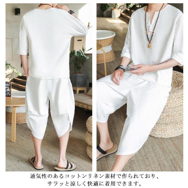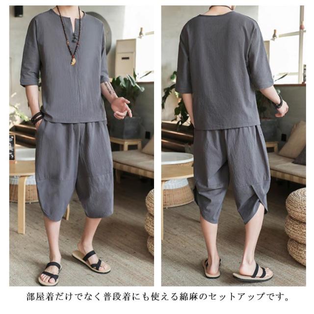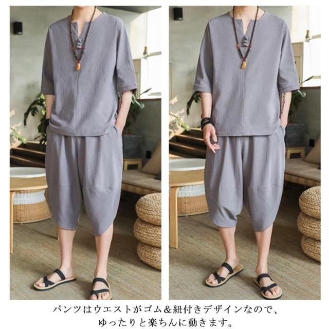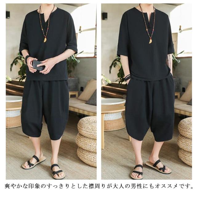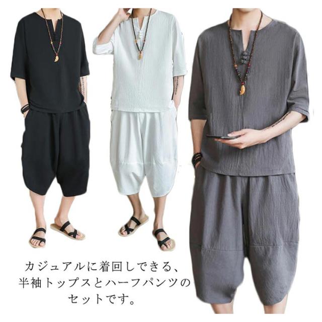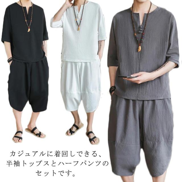 上下セット セットアップ リネン メンズ 2点セット ワイドパンツ サルエルパンツ ルームウェア 半袖 薄手 トップス ハーフパンツ 部屋着 プレゼント ゆったり リラックス カジュアル 夏物
