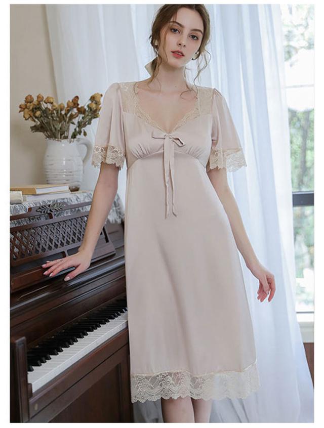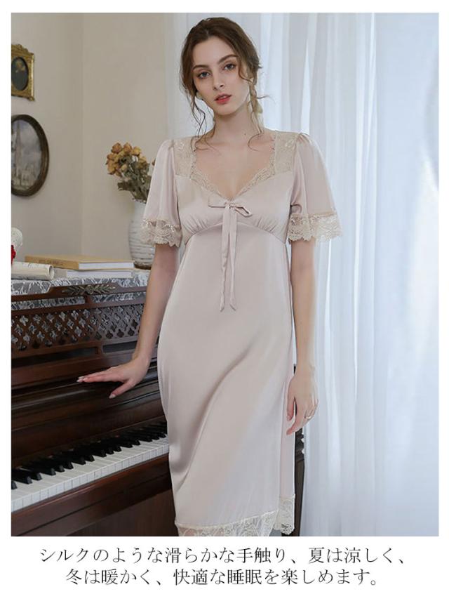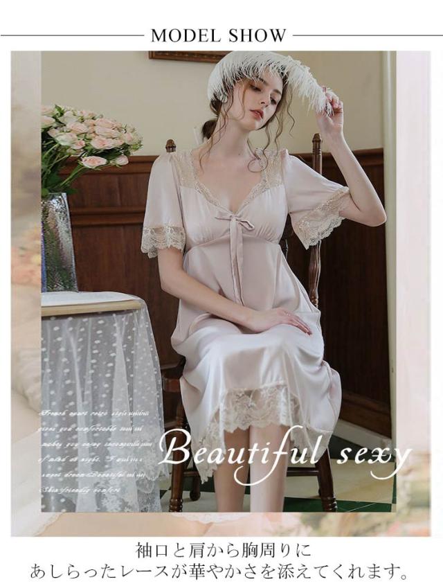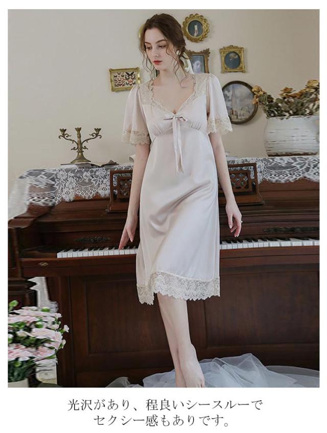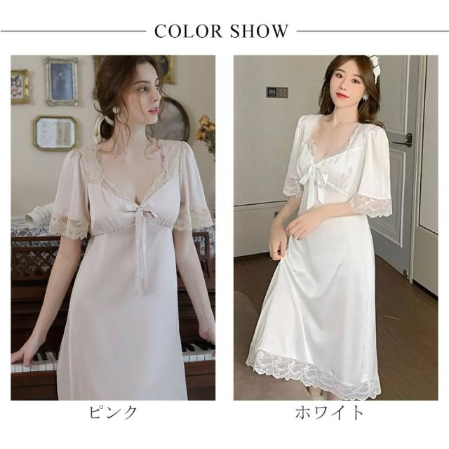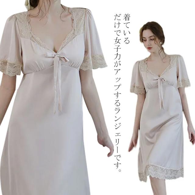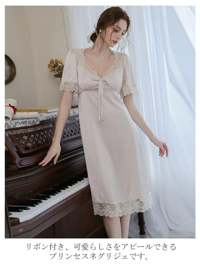 ネグリジェ ワンピース ミモレ ランジェリー 半袖 レース パジャマ 夏 レディース サテン リボン付き スリップ ルームウェア ナイトウェア 部屋着 ロングワンピース ドレス 送料無料