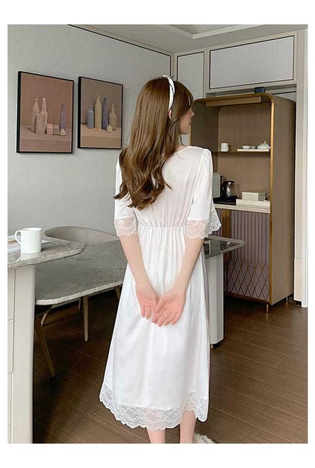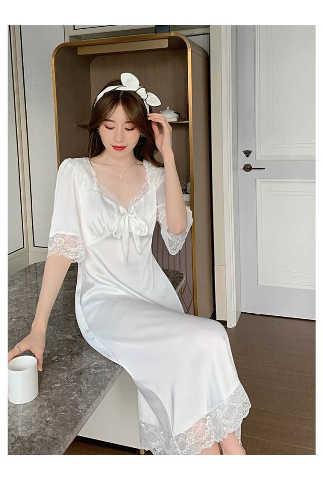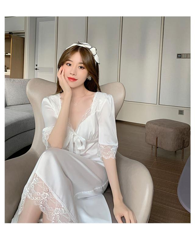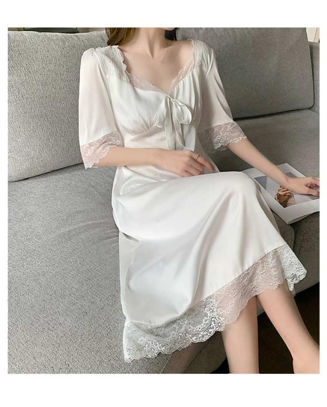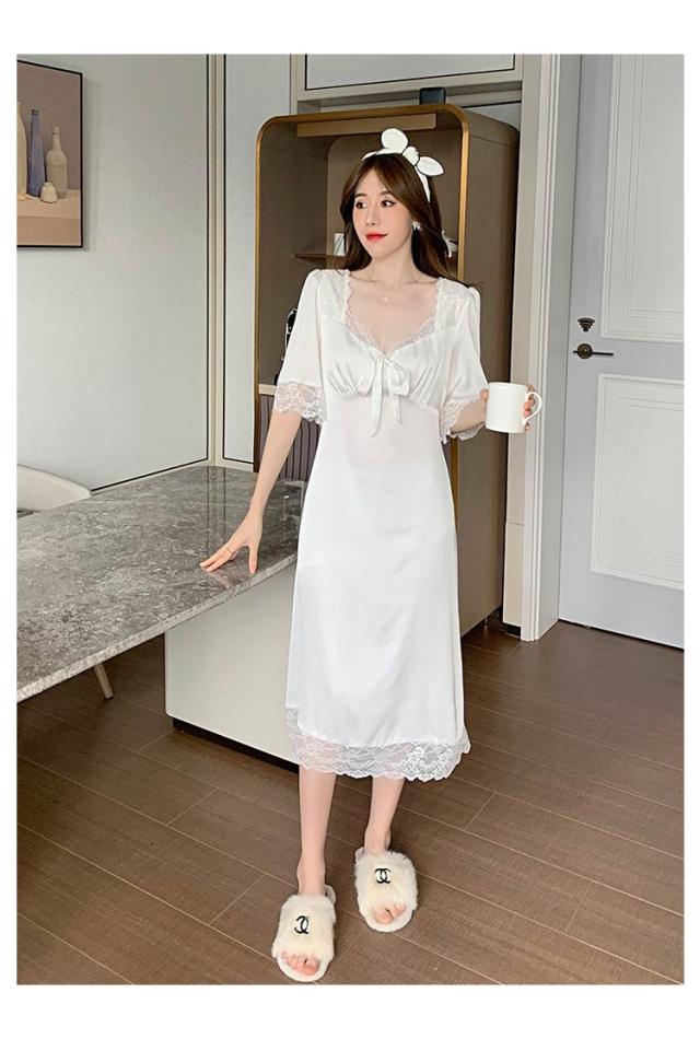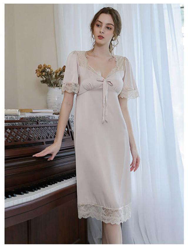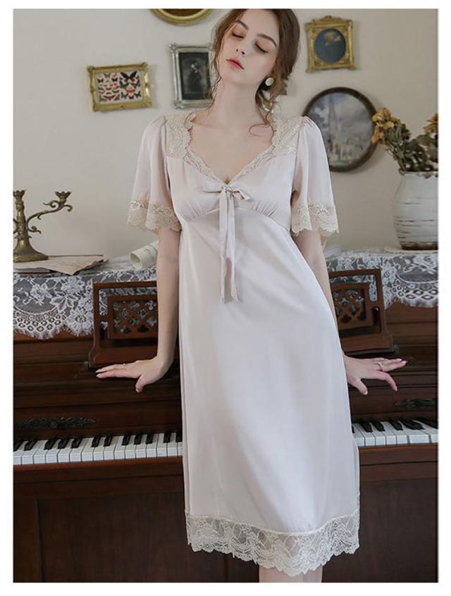 ネグリジェ ワンピース ミモレ ランジェリー 半袖 レース パジャマ 夏 レディース サテン リボン付き スリップ ルームウェア ナイトウェア 部屋着 ロングワンピース ドレス 送料無料