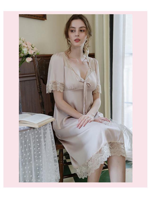 | 着ているだけで女子力がアップするランジェリーです。 袖口と肩から胸周りにあしらったレースが華やかさを添えてくれます。 シルクのような滑らかな手触り、夏は涼しく、冬は暖かく、快適な睡眠を楽しめます。 高品質なサテンで作られ、通気性があり、着心地良く眠ることができます。 光沢があり、程良いシースルーでセクシー感もありです。 リボン付き、可愛らしさをアピールできるプリンセスネグリジェです。 | |