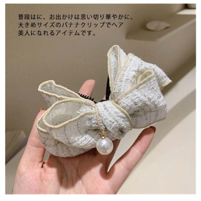 | リボンとパールがクリップを覆い隠すほど、大きく両サイドについています。 シーンに対して、2色選択できるセットです。 普段はに、お出かけは思い切り華やかに、大きめサイズのバナナクリップでヘア美人になれるアイテムです。 | |