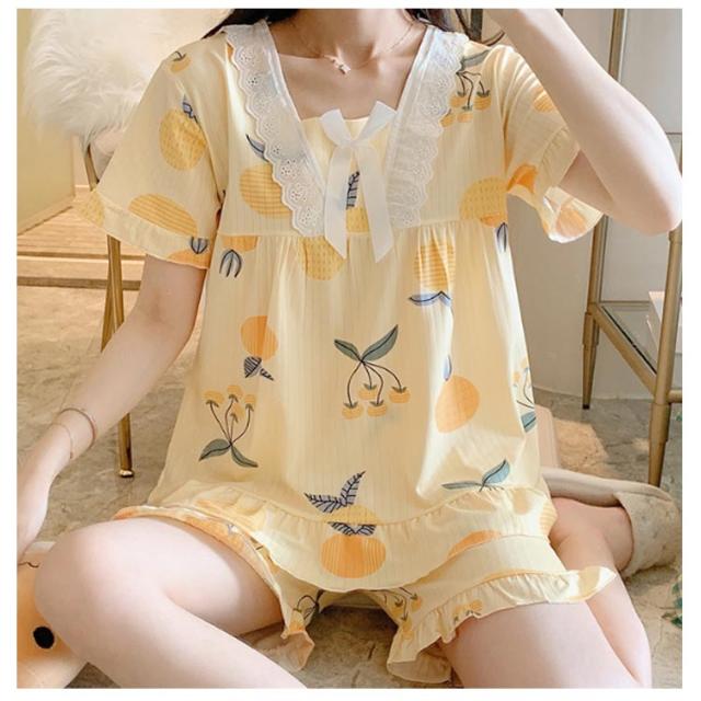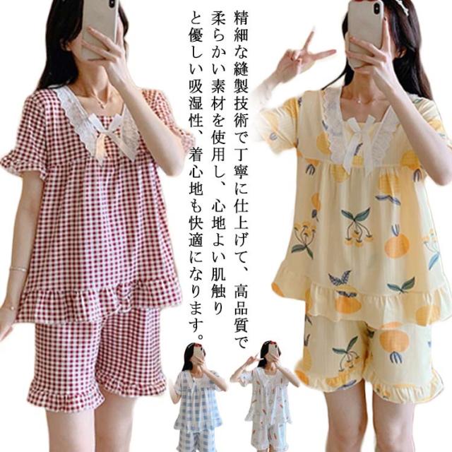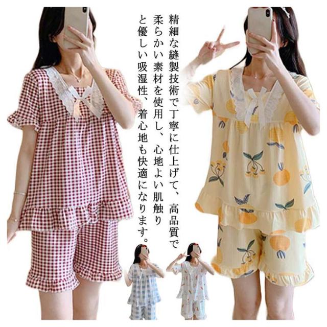 レディース パジャマ 半袖 ゆず柄 チェック柄 レース リボン 短パン 半ズボン 上下セット 薄手 涼しい 女性用 綿 ルームウエア 部屋着 寝巻き おうちコーデ 春 夏 ナイトウエア ゆったり 大きいサイズ 大人