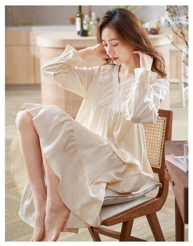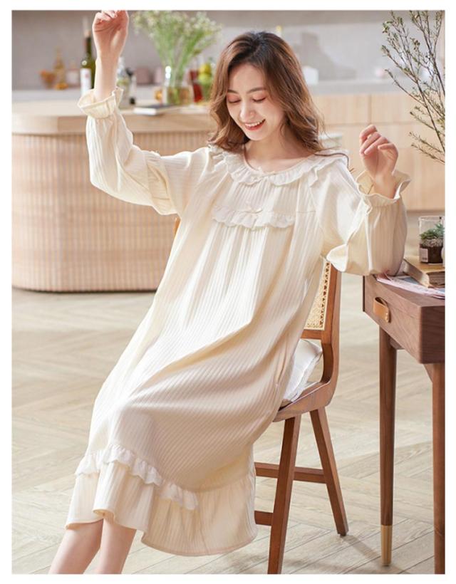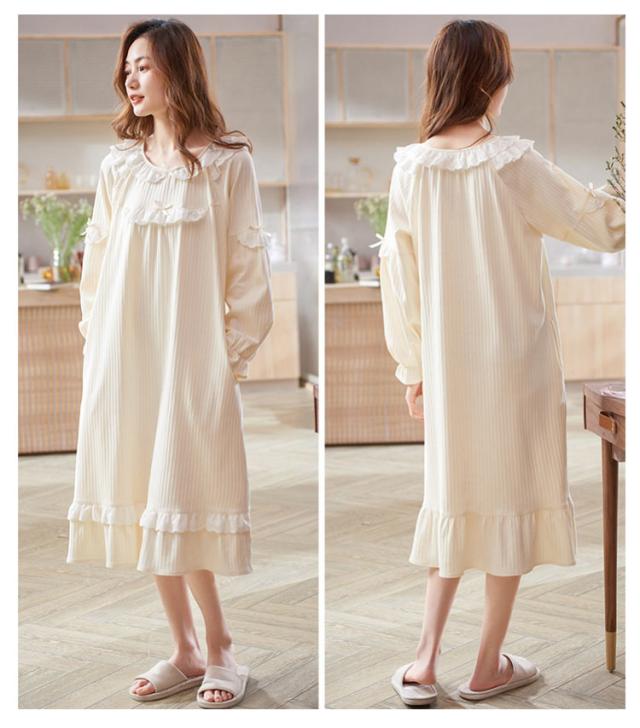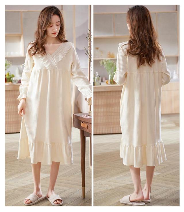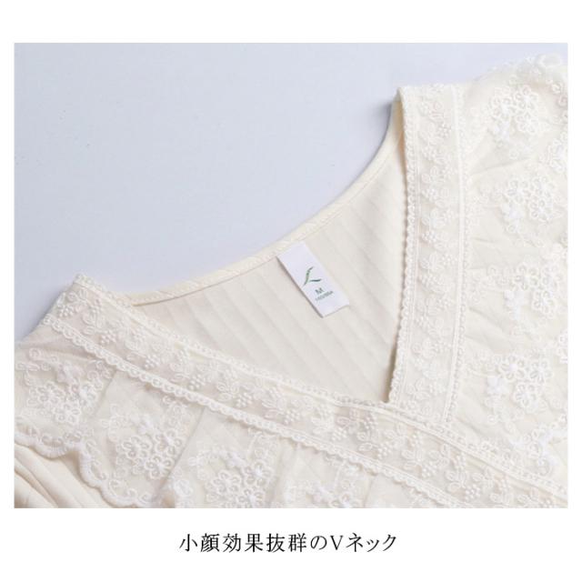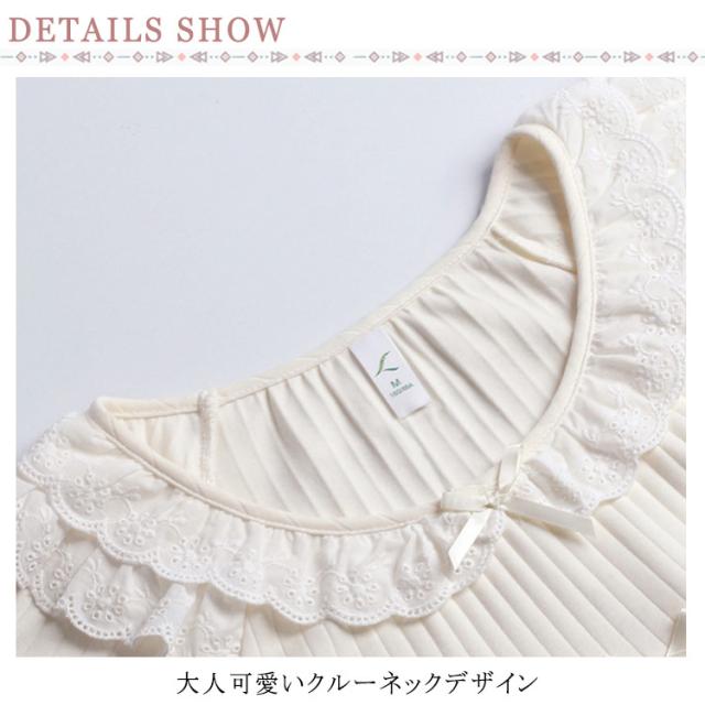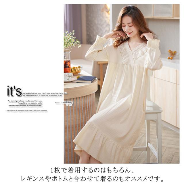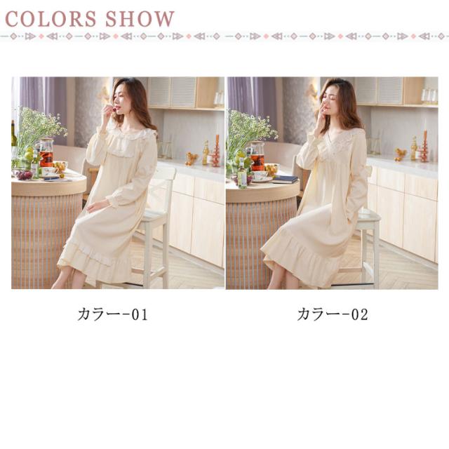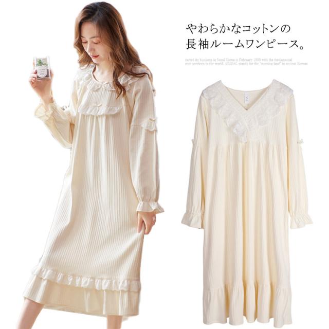 ルームウェア レディース ルームワンピース おしゃれ パジャマ ワンピース 長袖 ロング丈 やわらかい コットン 秋 春 部屋着 寝間着 旅行 ガーリー レース フリル シンプル ナイトウェア 宮廷風 姫系 送料無料