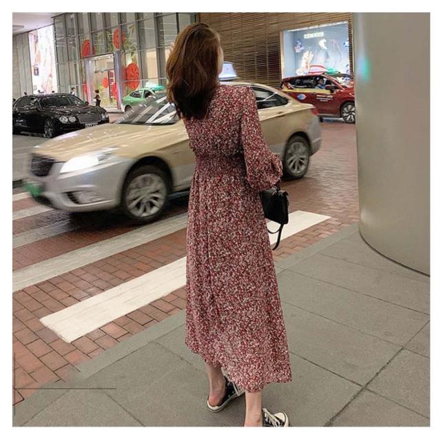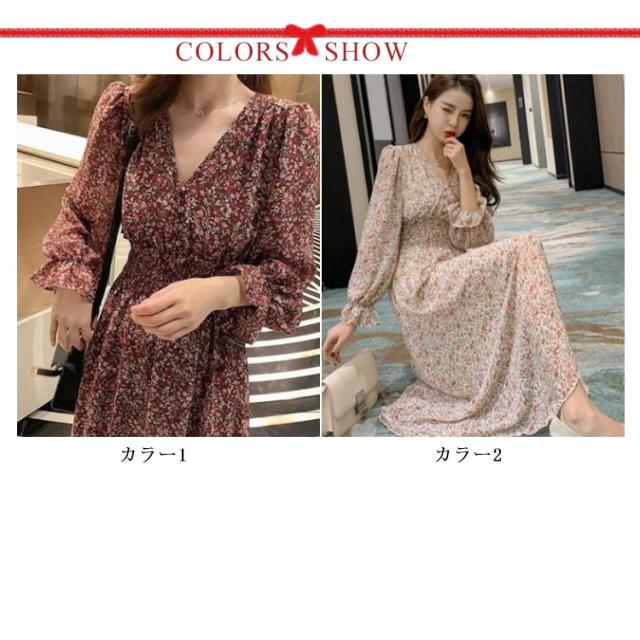 送料無料 ワンピース レディース 花柄ワンピース ロングワンピース 長袖 マキシワンピース 総柄 バルーンスリーブ フレアワンピース ウエストゴム ロング丈 Vネック Aライン 着痩せ かわいい 体型カバー 清楚